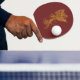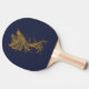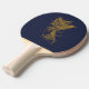un diseño de lino dorado decorativo de un ave fénix despegando sobre una paddle de ping pong rojo y azul