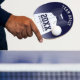 Cara de juego boda lista para el partido Team Bride vs Team Groom Ping Pong Match. Puede añadir su año boda a esta pista de tenis de mesa con temática azul marino.