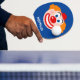 Un payaso gracioso frente al ping-pong para jugar al ping-pong. Paddle de ping pong personalizado para el ping-pong. Idea de regalo de juegos deportivos para niños. Color de fondo personalizado. Dibujo de mimo lindo con gorra rojo y pelo naranja.