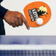 Feliz ilustracion de diseño de texto de Halloween con decoración de casa embrujada, cementerio y murciélagos en luna llena sobre fondo naranja de grano