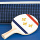 Ping pong paddle with flag of city of New Orleans, Louisiana; white flag with red and blue stripes and three golden fleur-de-lys