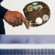 Fondo de madera marrón con mar, cresta mecánica, volante antiguo, ancla dorada y varios engranajes de oro y latón. Estilo Steampunk.