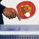 Parrilla barbacoa sobre carbón de combustión, banner de desplazamiento con texto personalizado sobre las tonalidades y pincel cruzados. Color de fondo personalizado. Texto inferior personalizado.