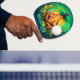 Una plataforma de ping pong con un diseño de Halloween, con una calabaza personalizado con cara sonriente y ojos brillantes, ambientada en un fondo verde y azul con viñas y nubes giratorias, la palabra "HALLOWEEN" está escrita con un estilo en la parte inferior del remo, la manija del remo está hecha de madera clara con patrones verticales de grano.
