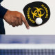 Icono de advertencia de riesgo biológico. Texto personalizado. Patrón sin foco en la parte trasera.