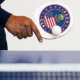 Insignia de Idaho con bandera de Idaho y bandera de los colores de EEUU, forma redondeada. Emblema de Idaho. Sello de Idaho. Colección de Estados Unidos.