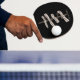 Una espada con una cinta deslizante, con el versículo de la biblia Lucas 22:36 sobre ella. El que no tiene espada, que venda su ropa compre una. El diseño general es negro y gris.