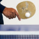 Mezclador de hormigón beige con alas, pickaxe y pala.