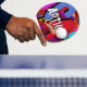 Elegante tenis de mesa personalizado con su nombre en estilos de letra fríos, y con grandes letras iniciales rojas y azules con sombra negra... moderno diseño monogramado, con el nombre del jugador elegante... fondo abstracto inspirado en el cómic.