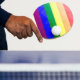 Bandera LGBT arte digital arcoíris colores rojo naranja amarillo azul verde púrpura con diseño geométrico moderno.