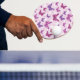 Patrón inconfundible de mariposas voladoras en tonos rosados y morados con flores blancas sobre fondo rosa pálido. © y ® Bigstock® - Todos los derechos reservados.