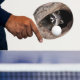 Joven y simpático mapache mirando desde el interior de un árbol grande.