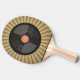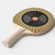 Una plataforma de ping-pong con un diseño de un disco de vinilo en el centro, rodeada de rayas de oro y blanco alternas con un patrón de puntos de polka, ambientado con un fondo blanco y claro. La manija de la paleta está hecha de madera clara con sutiles patrones verticales de grano. El diseño del registro de vinilo incluye un disco negro con ranuras concéntricas y una etiqueta central de color melocotón. El estilo general es gráfico y retro, con una estética limpia y minimalista.