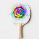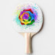 Rosa grande y floreciente con pétalos de arco iris sobre fondo blanco, pintado con salpicaduras de pintura colorida y brillante. 3.ª