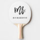 Esta paleta elegante del ping-pong dice a "Sr." en tipografía negra de moda de la escritura en un fondo blanco, y también tiene un punto para su apellido.