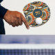 This trendy ping pong paddle sports a mix of modern and retro with colorful jazzy swirls and dots. Colors include a trendy vintage color palette of gold, light orange, deep orange, dark teal, blue, navy, black, and cream. Your monogram initial appears in a swirly typeface font in light orange encircled in a color block of deep teal blue. A coordinating ping pong ball is available.