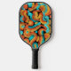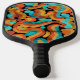 A fun and unique pickleball paddle that won't look like everyone else's! An abstract design of orange, gold and bright blue on a black background. The design is on both sides of the paddle. Stand out on the court!