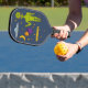 Crear un regalo personalizado pequeño fuera de este mundo. Esta paleta de pickleball tiene ilustraciones de alienígenas del espacio verde limón, un ufo o platillo volador, estrellas, lunas y planetas y está lista para ser personalizada con un nombre.