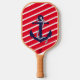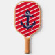 Los ancestros pesan con este diseño. Es una navegación suave con estas rayas diagonales rojas y blancas. En la parte superior hay un ancla azul con cuerda blanca. Estas paletas están aprobadas para su uso por USA Pickleball (anteriormente USAPA). Puedes elegir tu color de agarre, negro, blanco o bronceado. Por un suplemento, podrá adquirir una cubierta protectora y una pelota de baloncesto al aire libre.