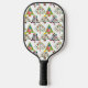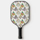 Este remo de pickleball tiene un diseño moderno de mediados de siglo de árboles navideños de diferentes estilos. Una tiene una rejilla con rectángulos con estallidos en el interior. Otro tiene rectángulos redondeados con rectángulos más pequeños dentro. Un tercio tiene líneas curvas con estrellas sobre ellas. El árbol final es un triángulo con otros triángulos más pequeños dentro