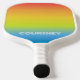 Esta paleta de pickleball de color arcoiris presenta tiras mezcladas de un estilo sombrío en rojo, naranja, amarillo, verde y azul. Está listo para ser personalizado con un nombre con letras blancas en la parte delantera del remo.