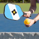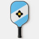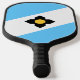 Paddle de pelota con bandera de la ciudad de Madison, Wisconsin; bandera azul claro y blanca con una cruz negra y círculo amarillo en el centro
