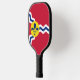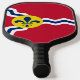 Paddle de pelota con bandera de la ciudad de St. Louis; bandera roja con olas blancas y azules y fleur-de-lys azules en círculo amarillo