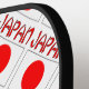 La bandera japonesa, una bandera blanca con un círculo rojo en el centro, se ve aquí con la palabra JAPÓN bajo la bandera, en letras rojas en una paleta de pickleball. El diseño está embaldosado para el efecto artístico. Un espacio blanco de cuadrados escrupulosamente te da un toque personalizado a tu nombre. Si desea crear un regalo personalizado, agregue el nombre de otra persona.