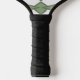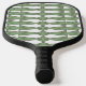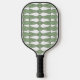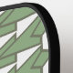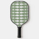 Esta paleta de pickleball tiene un diseño art deco de triángulos y diamantes que parecen bolas de verde claro y verde salado.
