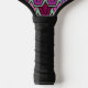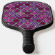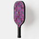 Esta paleta de pickleball tiene un diseño art deco de tulipanes de pentagones y trapezoides en diferentes tonalidades de morado.