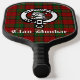 Pickleball paddle presenta la insignia del escudo del Clan Dunbar escocés y texto de personalizable sobre fondo tartán