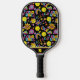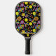 Negro, Paddle de bolas de bolas con Groovy, estilo de los años 90 retro patrón de bola de pickleball con bolas de picnic amarillas y fondo negro. Gran regalo para papá