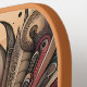 Una criatura mística está intrincadamente pintada en una tabla de madera, mostrando colores vivos y detalles complejos.