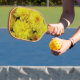 Paddle de pellebol que muestra una foto de flores amarillas de crisantemo. ¡Un bonito diseño floral! Seleccione el color del mango de la paleta de pickleball y otras opciones.