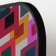 Esta paleta de pickleball tiene un diseño geométrico de cuadrados dentro de cuadrados marrones, negros, ladrillos, amarillos, verde azulados, verdes, morados, dorados, rosados, rojos, grises sobre un campo de gris más claro.