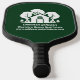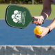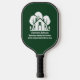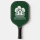 This forest green real estate company pickleball paddle is perfectly customized for a realtor who specialized in houses near the wilderness or woodlands. The white silhouette of trees behind a log cabin home and personalized with your agent and realty business name for marketing in the backwoods.