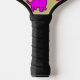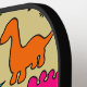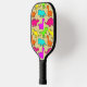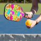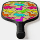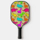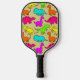 Esta paleta de pickleball tiene un diseño de novedad de dinosaurios dispersos por todo el diseño.