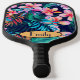 La pala de pickleball personalizado cuenta con hermosas flores isleñas/tropicales y hojas con texto de personalizable para añadir nombre o monograma.