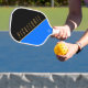 Este elegante diseño deportivo presenta texto PICKLEBALL en una tipografía elegante mostrada en una diagonal descendente. El texto está situado en el borde inferior del bloque de color negro diagonal superior. La parte inferior del diseño es naranja vibrante y azul intenso.