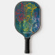 Este remo de pickleball presenta un diseño artístico y dinámico. La superficie está recubierta por un patrón de remodelación de pintura en diferentes tonalidades de verde, rojo y naranja, con trazos audaces de color brillante a lo largo del fondo azul pizarra, lo que crea una sensación de movimiento y profundidad.