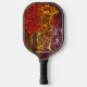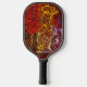 Este remo de pickleball presenta un diseño artístico y dinámico. La superficie está recubierta por un patrón de remodelación de pintura en diferentes tonalidades de verde, rojo y naranja, con trazos audaces de color brillante a lo largo del fondo rojo oscuro, lo que crea una sensación de movimiento y profundidad.