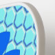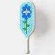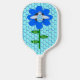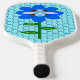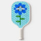 Esta impresionante Pickleball Paddle presenta una imagen gráfica de un lindo abejorro azul con rayas azules brillantes, ojos negros, antenas azules y piernas negras. Tiene alas azul y blanco bonito. La abeja está sentada en medio de un girasol azul bonito. La flor tiene un tallo verde y tres hojas. El mensaje "Bee Day boy" aparece esparcido por las tres hojas. El fondo está compuesto por un patrón de abeja azul pálido.