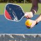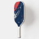 Un diseño retro genial que presenta un patrón de salpicadura de pintura grunge en rojo, blanco y dos tonos de azul que está lleno de movimiento. Personalice con tres iniciales en fuente blanca clásica con la plantilla fácil de usar. El diseño se repite en el lado reverso. Regalo perfecto de pickleball para él o ella.