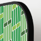 Esta paleta de pickleball tiene un diseño moderno de mediados de siglo de líneas verticales verdes con rectángulos arriba, repetidos a lo largo del diseño.