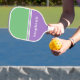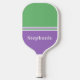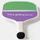 Esta paleta de pickleball es sencilla, moderna, minimalista, audaz y colorida con sus rayas violetas y verdes y su nombre.