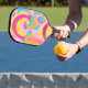 Moderno Monograma Rojo Azul amarillo Amarillo dorado Paddle de bola de palas Este moderno diseño de palas de pickleball cuenta con coloridos remolinos rosa, azul y amarillo, con su nombre o monograma en texto negro guiado para un aspecto sencillo y elegante, pero profesional. Hace el regalo perfecto para Navidades, cumpleaños, Día de la Madre, Día del Padre, Día de los Abuelos, graduación, retiro y más.