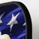 La parte delantera de este remo de pickleball muestra una imagen de un majestuoso águila calva norteamericana frente a la bandera de Estados Unidos. La otra cara es azul marino sólido con su monograma en blanco en la parte inferior.