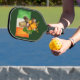 Esta pádel de pickleball de temática irlandesa tiene la imagen de un gracioso gnomo rojo con barba vestido con un gorra de vaquero, botas occidentales con hebillas irlandesas y rocas de champú. Fuma una gran pipa y se para delante de una bandera de Irlanda, y el fondo es verde oscuro. En la parte inferior de la parte posterior está su monograma de tres letras en verde claro.