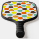Esta paleta de pickleball tiene un diseño geométrico de puntos azules, naranjas, amarillos y marrones.