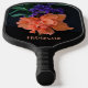 Esta impresionante pala de bolas de pato tiene un cierre de una flor hibiscus de color naranja y coral con flores moradas y hojas verdes. Esta floral tropical vibrante se despliega sobre un fondo negro dramático. Esta elegante paleta de pellebol será un hermoso y exótico regalo para ser valorado especialmente cuando se personaliza con su nombre. Esta imagen es fotografía botánica original de JLW_PHOTOGRAPHY.